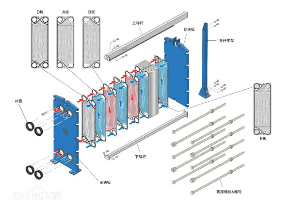 板式換熱器是由一組波紋金屬板片組成,并且板片上有四個(gè)角孔,以供熱交換的兩種冷熱介質(zhì)通過(guò)的一種換熱設(shè)備。它是由板片、螺栓、夾板、法蘭、地角、密封墊片等組合而成的可拆式板式換熱器。